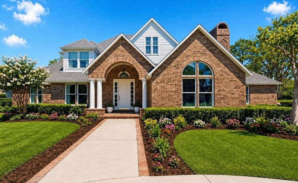 This curated 4-bedroom, 3.5-bath lakefront home offers the lifestyle today's discerning buyers are searching for. Set on a corner lot with a circular drive, the home welcomes you with a timeless brick fa?ade reminiscent of the French countryside and a sweeping staircase that creates a dramatic first impression. Inside, sparkling lake views immediately steal the show. Double doors open to a moody billiards room that could easily serve as a game room or refined home office. The two-story family room, anchored by a brick wood-burning fireplace, feels both grand and inviting. Natural light fills the home from every direction. The kitchen is a dream, blending warmth and character with marble countertops, double ovens, an oversized island, and a built-in bar for added function and style. A swinging door leads to the formal dining room, while the living room offers the perfect place to gather or unwind. The oversized first-floor primary suite captures peaceful lake views and includes a beautifully appointed bath with a fluted double vanity, garden tub, two spacious closets, and a frameless walk-in shower. Upstairs, two of the three bedrooms boasts ensuite bathrooms. Outside, the oversized lot showcases one of Odessa's hidden gems: Lake Maurine, a freshwater ski lake. Located in an A-rated school district and just minutes from Publix and the Veterans Expressway, this home offers the perfect blend of convenience, charm, and waterfront living.